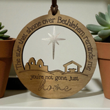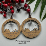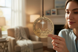 Each ornament is beautifully layered with eco-friendly wood and clear acrylic, featuring a radiant silver star of Bethlehem above a delicate nativity silhouette. Every piece is laser-cut, engraved, and assembled by hand, creating a timeless keepsake that glows with comfort and meaning.