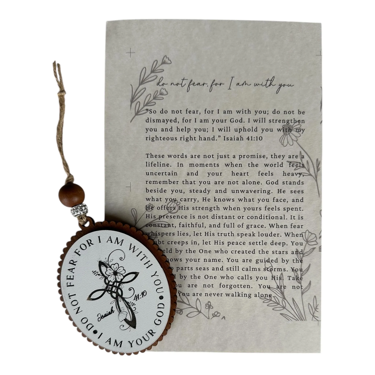 Each ornament is laser cut from premium maple plywood, hand-finished with care, and paired with a matching story card featuring the full scripture and a short reflection on God’s unwavering presence. Perfect for hanging in your car, home, office, or gifting to a loved one in need of spiritual comfort.