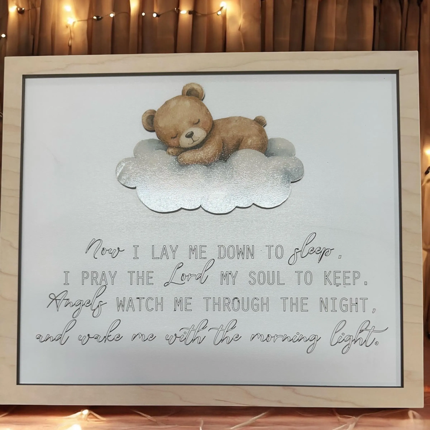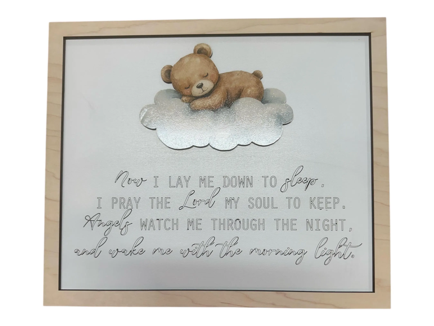 Create a cozy, dreamy atmosphere in your little one’s nursery with this beautifully handcrafted wall art featuring a sweet sleeping bear resting gently on a fluffy cloud. Elegantly engraved with the timeless bedtime prayer “Now I lay me down to sleep,” this piece brings both warmth and faith-filled comfort to your child’s room.